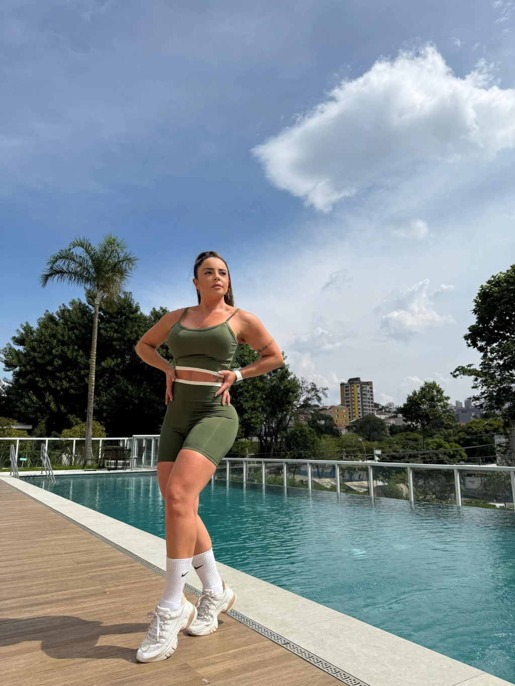Conjunto Tiffany em poliamida premium zero transparêncaia com detalhe superior .Cheio de estilo, esse Conjunto possui um material super leve, ideal para prática de atividades físicas, proporcionando uma ALTA COMPRESSÃO, deixando a peça ainda mais confortável. Ele também é ideal para treinos ao ar livre pois possui PROTEÇÃO UV 50+.